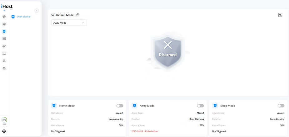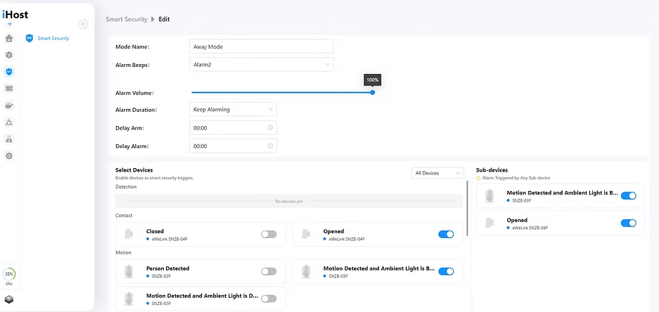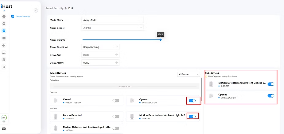 This means that if we activate the Away mode, and any of these sensors detect motion or if a door is opened, the iHost siren will sound.