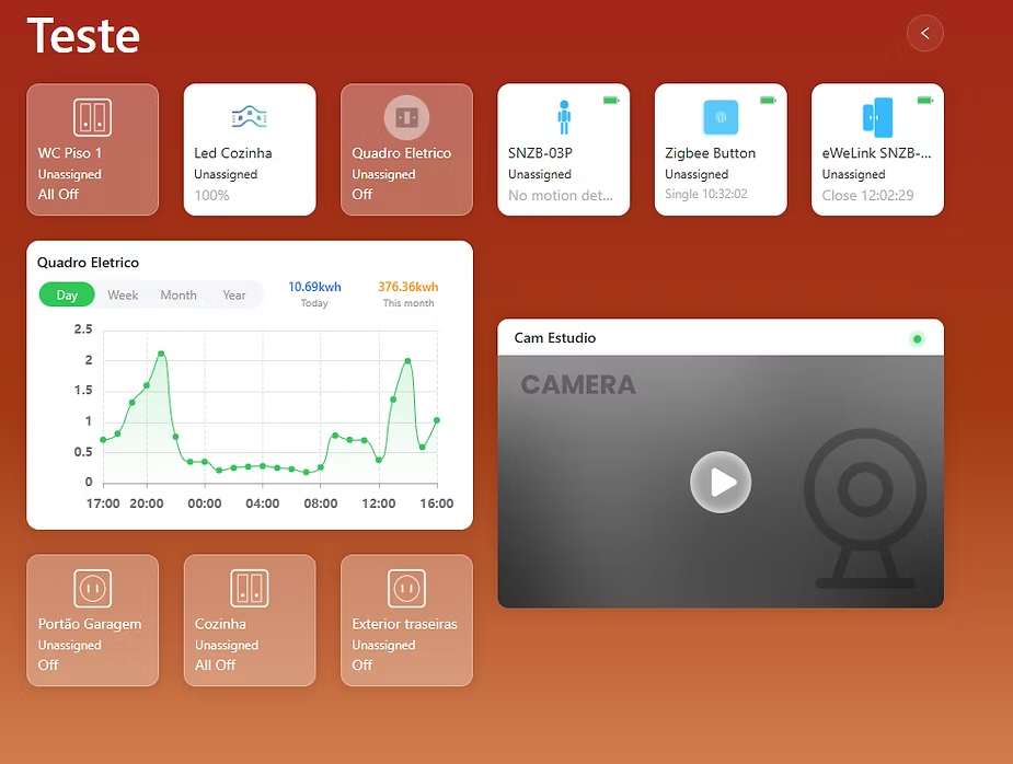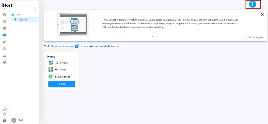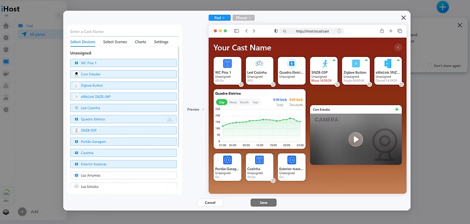 Let’s now talk about the eWeLink CAST feature.In this menu, we can create personalized dashboards based on the devices connected to the iHost. These dashboards can be customized according to our preferences and are automatically adjusted for tablets or smartphones.