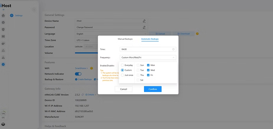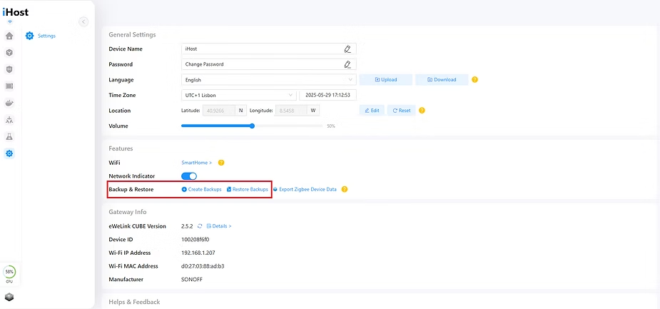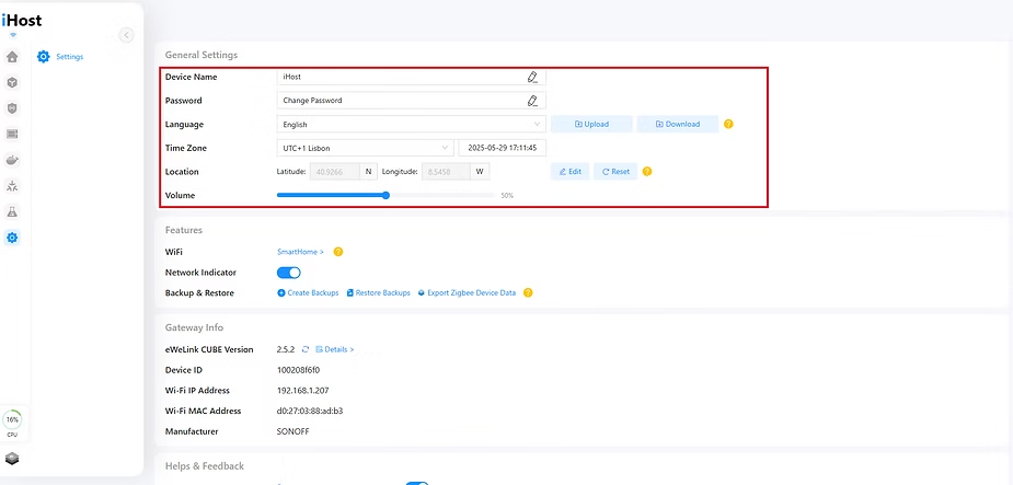 In this menu, you can access the general settings of the iHost. Here, you can change things like the iHost’s name, set a password, language, or time zone.