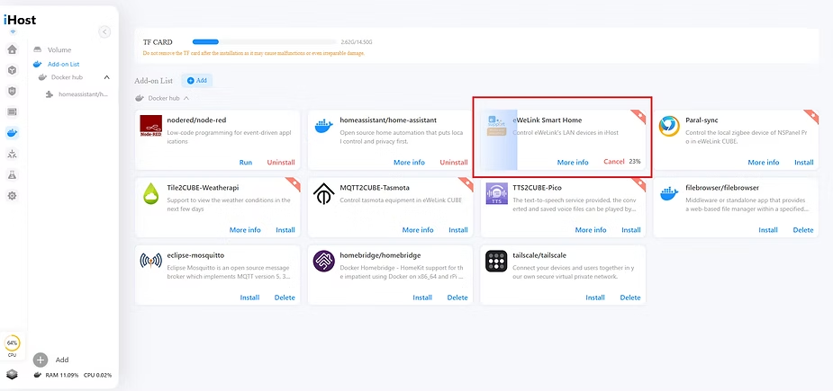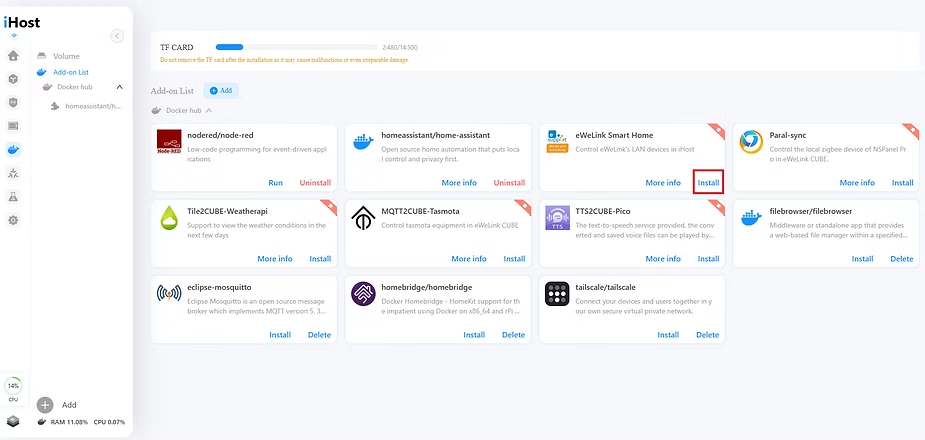 Installing it is quite simple. Just open the Docker containers page and find the eWeLink Smart Home add-on. Then click “Install”.